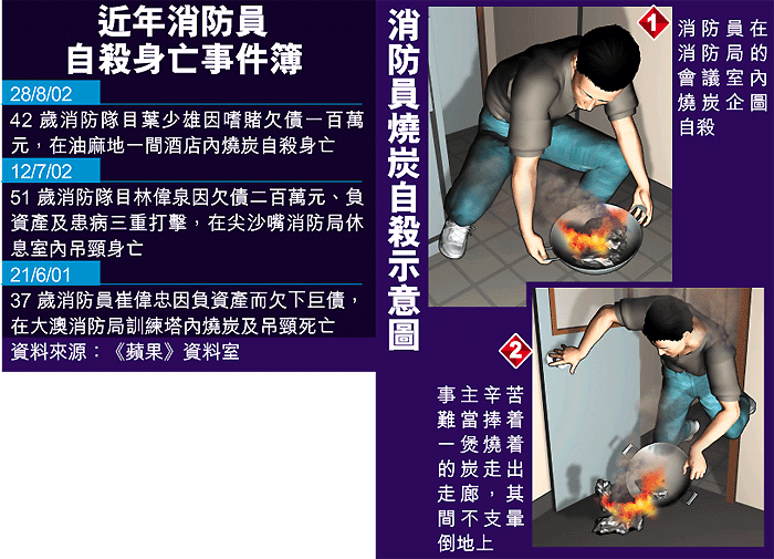 【本報訊】香港仔沙灣消防局昨日發生消防員在局內燒炭自殺事件,一名原本休假的消防員返回消防局,躲進會議室燒炭企圖自殺,其間懷疑辛苦難當,捧着炭煲走出走廊不支暈倒,在場其他消防員立即替他急救,經送院治理後情況穩定。警方初步相信事主是因為經濟拮据無能力供樓而自尋短見,消防事務處已安排人員向事主進行輔導。 記者:簡明恩、胡恩宏、謝明明