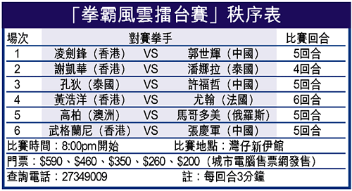 【本報訊】雲集泰國、俄羅斯、中國及香港頂尖拳手角逐的「拳霸風雲──國際職業擂台賽」,將於今晚在新伊館展開,二十二歲的香港首位職業女拳手謝凱華,將上演她的職業賽處女戰。
