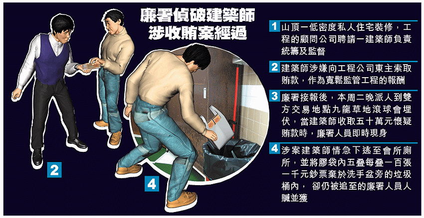 【本報訊】負責監督山頂加列山道一幢豪宅裝修工程的建築師,涉嫌向工程公司東主索取賄款,作為寬鬆監工的報酬,本星期二晚上在九龍草地滾球會交收五十萬元賄款時「當場斷正」,被在場埋伏的廉政公署人員拘捕,但期間年近六十的涉案建築師拒捕逃走,拿着袋有五百張一千元現鈔的膠袋,疾奔往會所廁所,將懷疑賄款拋棄在垃圾桶,但廉署最終仍人贓並獲。 記者:陳沛敏