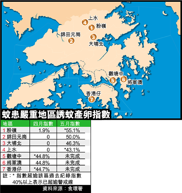 食環署昨日公布本港四月及五月份的最新誘蚊產卵指數,發現全港三十八個地區中,有七個地區的指數超過百分之四十,即有超過四成地方孳生白紋伊蚊,其中粉嶺、上水、觀塘中、香港仔四區更破了該區舊紀錄。食環署防治蟲鼠主任主管袁銘志表示,今年雨季剛來臨,行人通道上蓋及建材的積水未有及時處理,是蚊患惡化的原因。