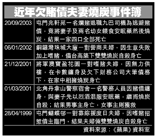 【本報訊】土瓜灣揭發雙屍案,一對年齡相差二十五年、嗜好賭馬賭波的老妻少夫,懷疑爛賭欠下巨債,走投無路下雙雙燒炭自殺,街坊聞到惡臭多日,到昨日終忍無可忍向警方報案,消防員破門發現兩人已死去多時,警方調查後認為事件無可疑,但兩人尋死原因有待進一步調查。 記者:梁瑞帆 吳淑義 羅振輝