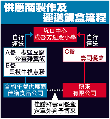 黃耀榮指出,為方便校內的師生午膳,校方去年跟位於觀塘偉業街的佳膳食品公司簽下合約,安排供應全校師生的午膳。至於肇事的壽司供應商博來有限公司,則為「佳膳」的另一間合作夥伴,位於香港仔黃竹坑業發街志聯興工業大廈,主要製作壽司供應多間學校及食肆,兩間供應商均領有食環署的飯盒及壽司牌照。