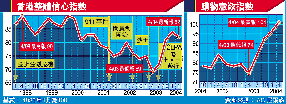 國際市場調查機構AC尼爾森4月底向1000名市民進行調查。結果顯示,由於市民對經濟信心持續樂觀,消費意欲亦相繼增強,更多市民願意在未來3個月作大額消費,購物意欲指數達到101,為97回歸以來新高,亦較1月底的調查再升5點。