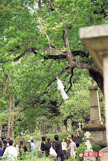 李克勤、許志安、鄭伊健、盧巧音、林子祥和林嘉欣等,昨天在跑馬地墳場拍攝電影《六壯士》,這場戲講述李克勤意外身亡後,眾好友到墳場送他最後一程,而演繹死後升天的克勤一直被吊在大樹上個多小時。