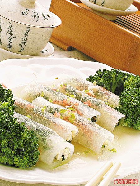 冬瓜片內裹以素火腿、冬菇、豆腐、雪菜及紅椒粒,清淡中帶點辣,頗為開胃,尤其適合悶熱的夏季享受。淋面的薄芡汁上再鋪上蟹柳碎及香芹,增色也增香。