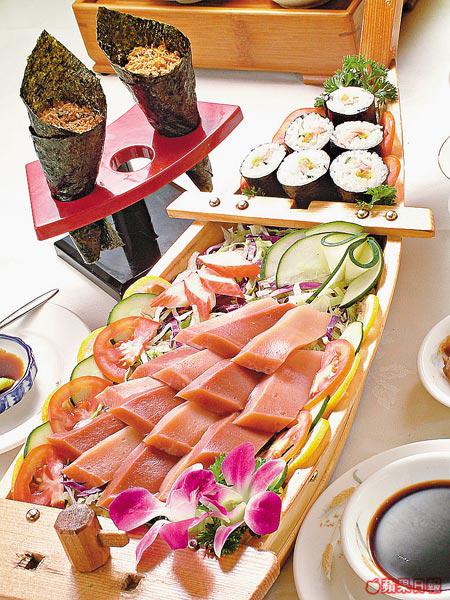 手卷內有苜蓿芽、青瓜條、素肉鬆及沙律醬,紫菜被烘紫機烘過固然脆卜卜,意外的是素肉鬆也相當香脆,蓋過了味淡的苜蓿芽;刺身有兩種,淺色的是金䱽魚,深色的是吞拿魚,兩者均是以大豆纖維及蒟蒻製成,咬落滑嘟嘟,帶點真正刺身的鮮甜,壽司卷則是用青瓜、素火腿及日本蘿蔔製成,較清淡。
