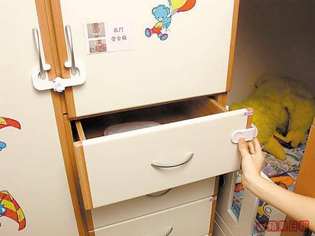 為免孩子拉開抽屜亂搞,及當梯級爬,可買專用的櫃門膠鎖,分別鎖緊門把及Lock實抽屜,以保安全。