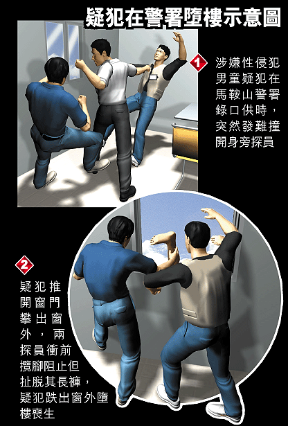 【本報訊】一名涉嫌於過去四年多次性侵犯一名現年十五歲男童被捕的孌童疑犯,昨午在馬鞍山警署新界南警察總部十四樓「關帝房」錄取口供時,懷疑趁被解下手銬時,突然發難撞開身旁兩名重案組探員,然後推開窗門攀窗跳樓;警方稱兩名探員衝前攬住疑犯雙腳企圖阻止,但疑犯被扯脫長褲仍死命掙扎,結果身穿底衫底褲翻跌出窗外飛墮二樓平台斃命。而死者家人則懷疑死者被屈及遭毆打致被迫跳樓喪生,家人並誓言追究到底。 記者:譚健文、 黃冠笙