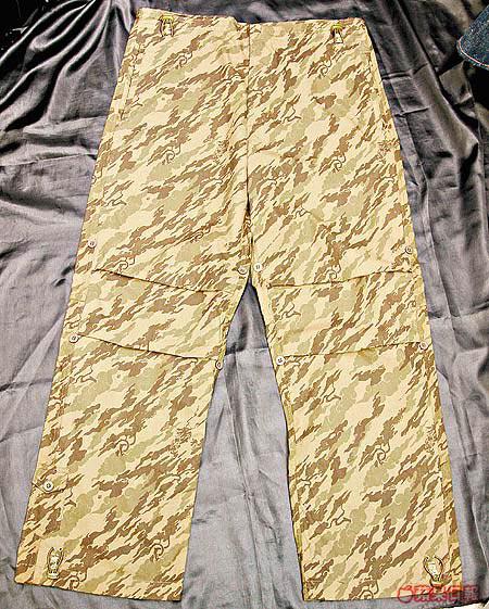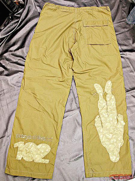 猶記得02年8月,MichaelLau展出的第102個Gardener就是HardyBlechman,估唔到04年的Maharishi新貨中,竟然見到劉米高這個Figure。褲後左腳刺繡,乃劉米高設計的Gardener102造型,即Maharishi主腦Hardy,另一邊則有102圖案刺繡。淡綠色102刺繡功能褲$1,880