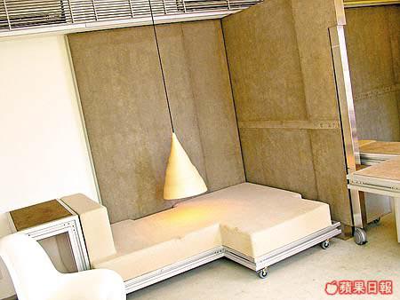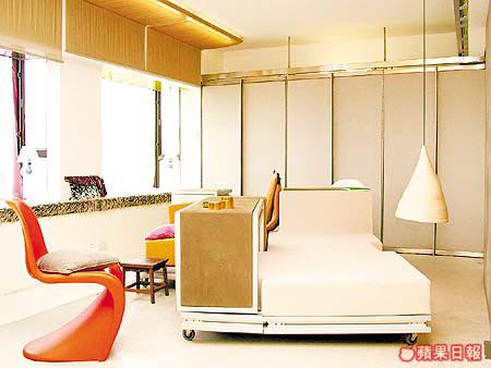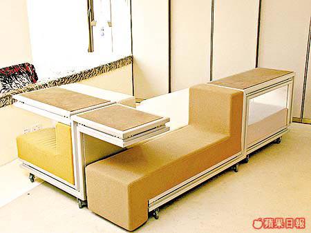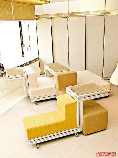 這裏是二胡休息、看書及睡眠的地方,為了節省空間,Ziggy設計出一個能滿足以上三項要求的家具,經過多次的設計及繪圖,終於設計出這張像玩具的3合1家具,外形更有點似俄羅斯方塊,可以砌出多款不同組合,增加了起居室的豐富感。