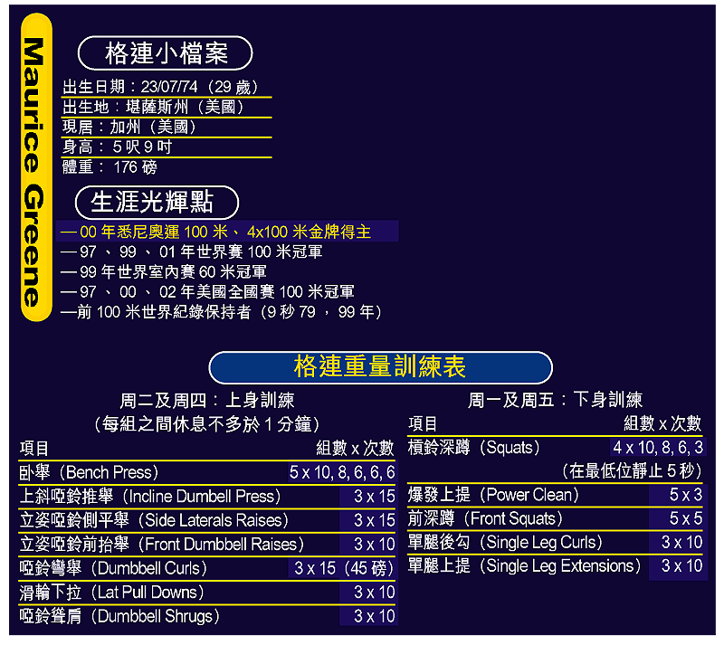 正當美國田徑壇正瀰漫着一片禁藥疑雲之際,男子一百米前世界紀錄保持者格連卻能獨善其身。格連堅稱自己的成績是苦幹而來,不靠欺詐,正因如此,他的苦練能給別人作為借鏡;現在他正加緊衝刺,誓要在雅典奧運上重奪失落的世界飛人榮譽。