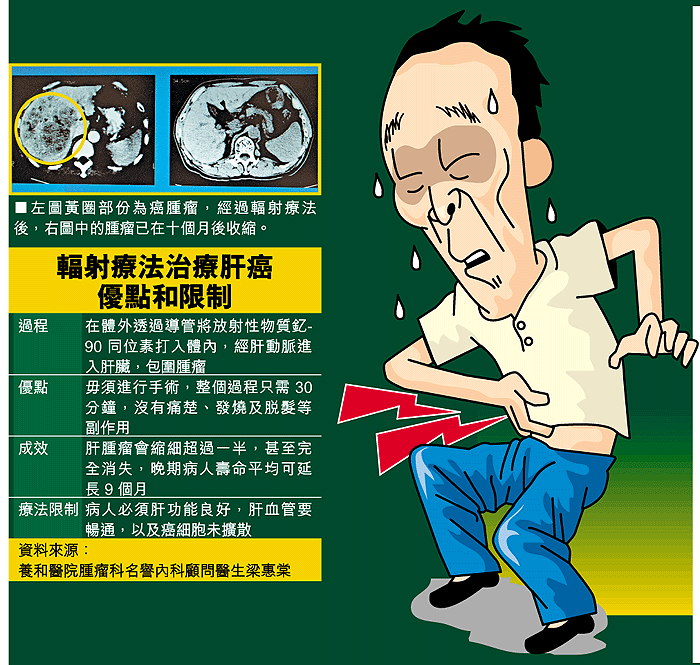 【本報訊】本港第二號殺手──肝癌,屬沒有病徵的癌症,病人確證患上時,腫瘤往往已長至布袋般大小,進行切除手術更有增加癌細胞擴散機會。不過,漸趨普及的治療肝癌輻射療法,以注射高能量輻射進肝臟殺滅癌細胞,不但有效將腫瘤縮細超過一半或完全消失,晚期病人的壽命也平均可延長九個月。 記者:蔡建豪