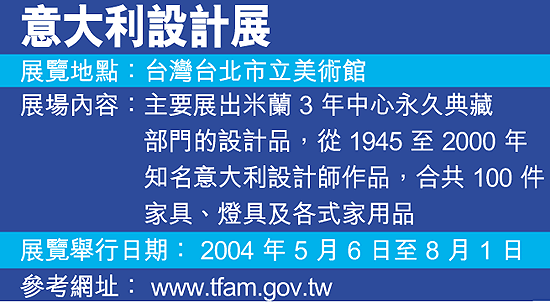 在台灣舉行的「意大利設計展」屬國際巡迴展覽,從1999年開始在歐洲、亞洲等地展出,是次來到台灣,將在台北展出3個月,會場內有不少意大利著名設計師的代表作,商品包括打字機、電單車、電視機、家具、燈飾及器皿等日常生活用品,是一眾設計迷不容錯過的「朝拜」經典作品良機。