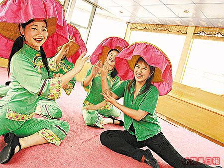 登上河源市最豪華的全新「東畫01」遊船,就知道河源民風有多清純簡樸。踏入船艙,見簡單的裝潢、小小的舞池,二樓一個天井,可從高處欣賞一樓的歌舞表演;步出甲板,眺望全長500多公里、被國家列為一級水質的東江,平靜江水兩旁,是蘇東坡家族的蘇家圍、錯落的客家村落以及綠竹長廊,河邊幾艘客家船屋在撒網捕魚,背後傳來客家姑娘的動聽歌聲,心境平靜又舒服。