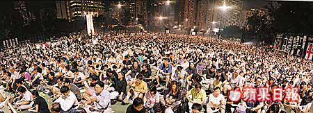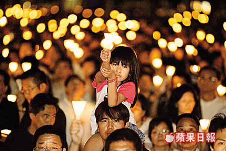 【本報訊】小紙杯盛起幽幽的燭光,映照着又善良又憂傷的臉;是數萬點星火堅持在一年一度的六月四日晚上亮起,照亮人心,照亮香港。維園昨夜的六四事件十五周年悼念集會,有八萬多名市民參加。忘不了的,是一種不死不滅的意識,十五年來,那種堅持執着從來沒有妥協過。 記者︰蔡元貴、莫劍弦、雷子樂