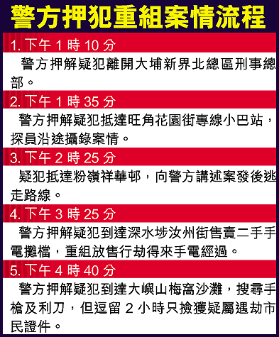 昨下午一時許,新界北總區重案組探員押解疑犯前往旺角花園街專線小巴站重組案情,由於現場位於鬧市,不少途人圍觀場面混亂,探員需在場開路及攝錄過程。約一小時後,探員將疑犯押至粉嶺祥華邨,由疑犯指示犯案後逃走路線。稍後,警方馬不停蹄押解疑犯到深水埗汝州街一帶售賣二手電話店舖,重組其出售手電經過。