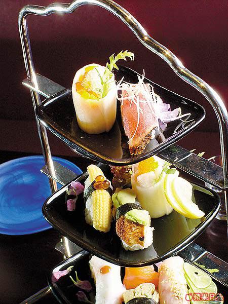 壽司全以人手製造,沒有機器那硬邦邦的感覺;用心留意的話,不難發現每一件壽司均很特別,以最頂層的燕窩壽司為例,燕窩沒有加任何雜質欺騙顧客,壽司外是以出色刀工「片」出薄薄的意大利青瓜包裹着;壽司拼盤以HighTea形式上枱,還包括鮮帶子、三文魚和鰻魚等時令壽司。(a)