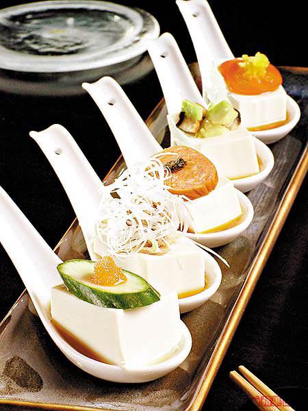 一口豆腐形式擺放,單看賣相已夠觀賞價值。每件日式豆腐上放上精緻材料,包括吞拿魚、墨西哥辣肉腸、牛油果等,將一匙食物放進口中,軟滑豆腐混和秘製醬汁,口感異常吸引。(a)