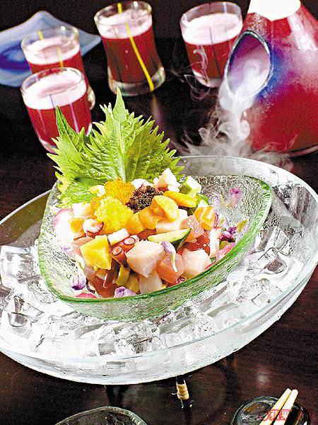 屬雜錦刺身餅,當中鮮橙色的是加拿大海膽,極新鮮沒有腥味,三文魚、吞拿魚、八爪魚、北寄貝等皆鮮甜爽口,冰鎮上枱,即使慢慢品嘗亦能保持新鮮;B-52有酒精成份,由蔓越莓(Cranberry)、提子、日本清酒、伏特加、菠蘿汁調製而成,喝下一口,首先會感受到果汁的甜味,然後清酒的香味便會從喉部慢慢滲出。(a)