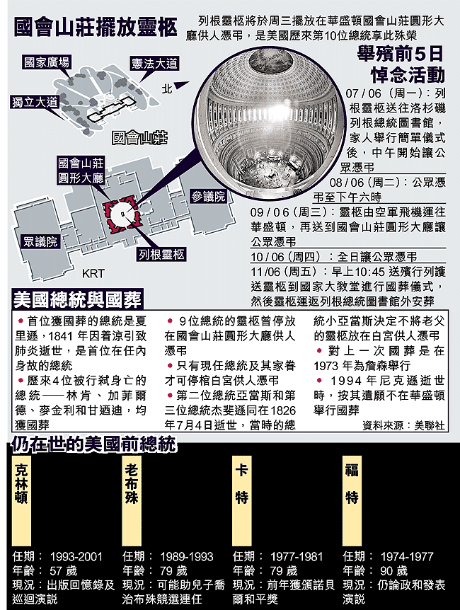 美國第四十位總統列根上周六在加州寓所逝世,舉國同哀。喪禮本周五會在首都華盛頓以國葬形式舉行,規模之大,料將跟另一位前總統甘迺迪出殯時相若。這是美國三十一年來首次舉行國葬,喪禮由軍方、國土安全部、特工處與國務院籌辦,單是負責保安的軍人就多達三千。