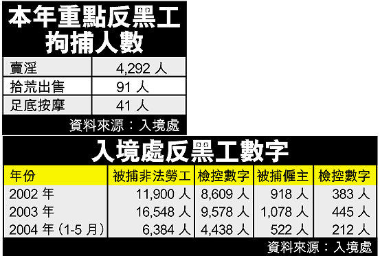 【本報訊】入境事務處針對不同工種的黑工,採取重鎚的打擊策略,過去三日聯同警方,在全港掃蕩非法拾荒出售的訪港內地人,拘捕了五十二名涉嫌非法勞工,其中五人已被法庭重判監禁四個月。入境處又在今年首五個月,「放蛇」查處近四十間足底按摩店,拘捕四十一名來自內地的懷疑黑工。