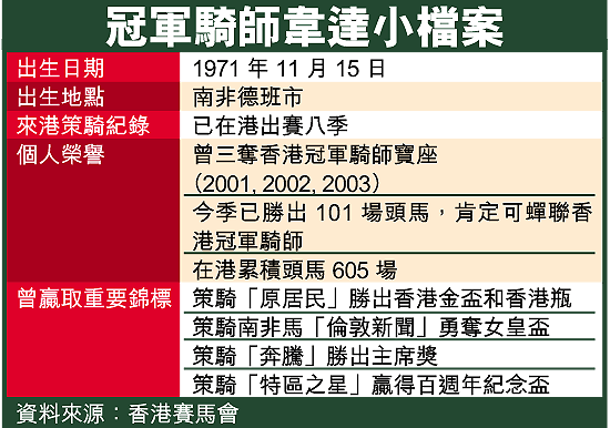 【本報訊】已穩奪今屆香港冠軍騎師寶座的南非籍騎師韋達,昨晚頭場賽事策騎梁定華馬房五班馬「過江龍」,順利勝出今季個人第一百場頭馬,成功創造本港賽馬史上首位騎師於季內贏取百場頭馬的輝煌紀錄。韋達更於第六場賽事憑賭王何鴻燊愛駒「走石」錦上添花,一口氣衝破一百大關,勝出今季第一○一場頭馬。 記者:蔡建豪