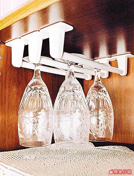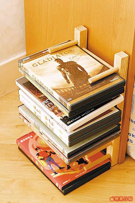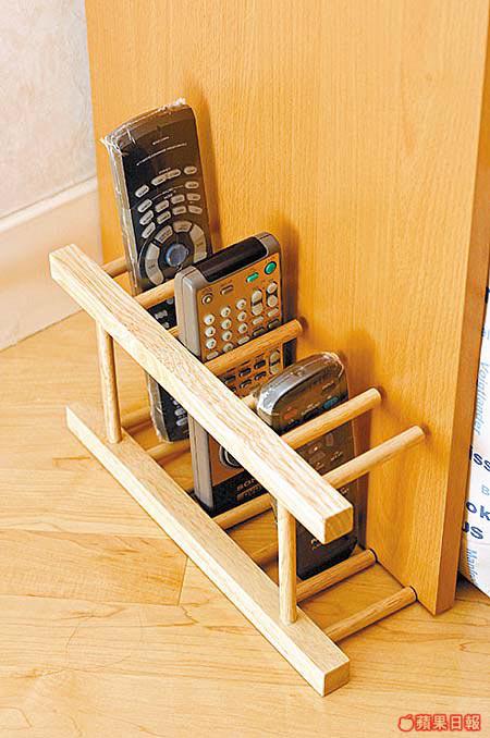 原本是個餐碟木架,但只要將它垂直放並固定在廳中的矮櫃旁,便變作一個DVD架;再轉一轉打橫放,更可用來擺放多個遙控器,一架多用。