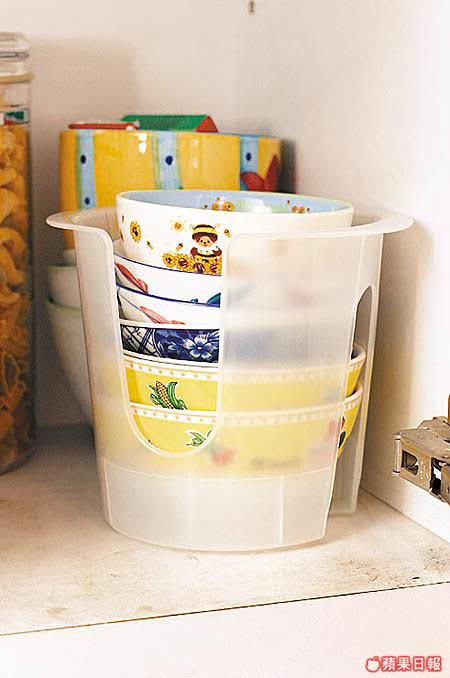 一般都會將碗碟叠高一戙戙放入櫃,但易有碰撞!不妨將飯碗放入膠筒內,防撞之餘,成個膠筒拎起,易過下下要雙手將一戙飯碗抬上抬落。