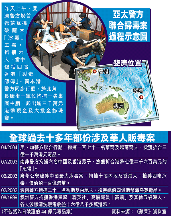 本港警方表示,由二○○三年開始,本港警方聯同澳洲、新西蘭、馬來西亞及斐濟等國家的警方對一個亞洲販毒集團展開調查,發現該集團專門從事製造安非他命(冰毒)、並涉嫌販運冰毒、海洛英、大麻及搖頭丸等毒品往亞太區及歐洲各國。