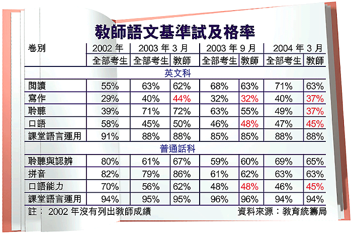 【本報訊】教育統籌局最新語文基準試結果顯示,應考的英文科教師除了寫作能力不濟事,應考聆聽試的成績也令人慘不忍睹,分別有六成應考英文科的教師在上述兩科「肥佬」,另外有五成半應考英文口語教師不及格。逾二百名近年入職的英文教師未能趕及在限期前達標,今年九月起不可再任教英文科。 記者:倪清江