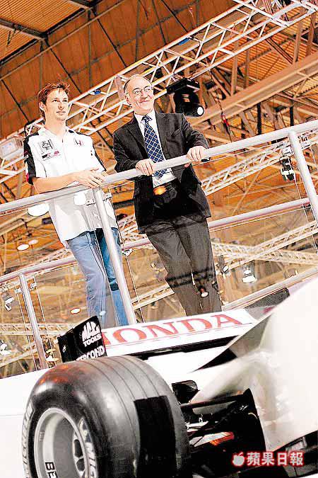 剛駕駛這部本田一級方程式跑車贏得摩洛哥大賽冠軍的英國車手JensenButton(圖左),親臨車展為車隊作宣傳。