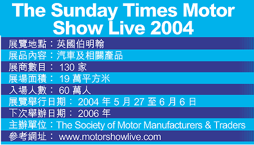 1903年,英國倫敦舉行第一個汽車展,當年共有113部汽車參展。時至今日,這個汽車展移師至伯明翰舉行,因要有十多萬平方米的場地,才可容納逾百家公司的近千部汽車及數十萬名參觀者,這項英國車壇盛事就是「TheSundayTimesMotorShowLive」。
