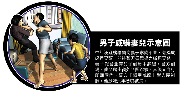 【本報訊】葵涌葵盛東邨一名爛賭中年漢,疑賭輸索錢不遂與妻發生爭執,他向妻揑頸及持菜刀揮舞聲言要斬死妻兒,警方接報到場,他又聲稱被警察「屈襲警」,爬出窗外企圖跳樓自殺,事件擾攘兩個多小時,有街坊不滿向他粗言責罵,他自行返回屋內,警方「鐵甲威龍」衝入屋將其制服,他涉嫌刑事恐嚇被捕帶署調查。 記者:吳國威、馬耀文