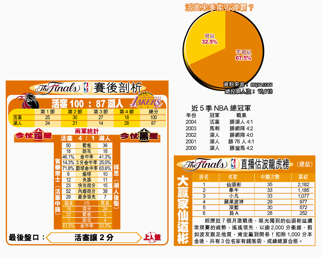 底特律活塞創出二十九年來NBA總決賽最大冷門戰果。不靠超級巨星、無視賽前被睇死,靠的是群策群力、滴水不漏的防守及無比決心,活塞周二在一面倒優勢下以一百比八十七處決苟延殘喘的洛杉磯湖人,以總成績四比一重登闊別十四年的聯盟盟主寶座。