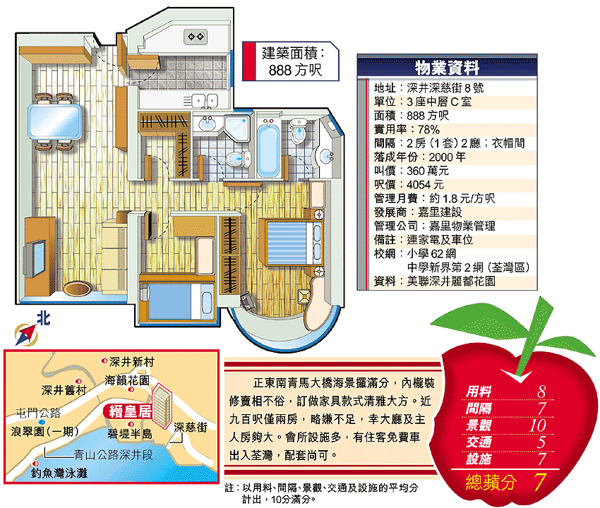 馬灣珀麗灣開售,深井碧堤半島二期蓄勢待發,青山公路沿線物業再次成為市場焦點。美聯區宇彥說,其中海景視野因三期的興建而出現變化的碧堤半島一期,二手市場不乏封盤企硬例子,至於規模較細的縉皇居,1座部份單位海景同樣受影響,2及3座的景觀變數最少。目前約有30多個888方呎單位放盤,平均分布各座,開價由望廠房的260萬元,至全海景380萬元不等。至於成交,3座低層C,888方呎,上月中以275萬元易手,每呎3097元,由於不連車位兼層數低,造價較平。