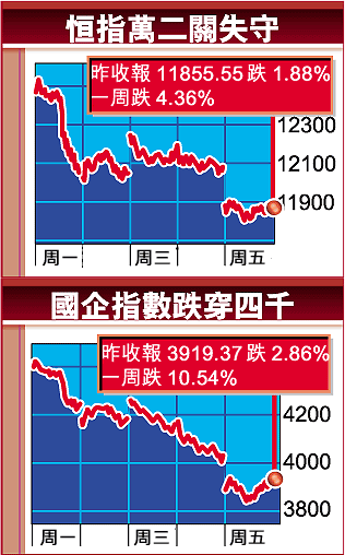 【本報訊】受加息陰影、內地宏觀調控及民企爆煲的衝擊,港股本周走勢疲弱,恒指及國企指數昨日更雙雙跌穿250天平均線,恒指萬二關再度失守,本周累計下跌540點。證券業人士普遍預料,在美國月底議息前,港股仍會反覆下跌,暫時不宜「撈底」;美林證券更調低港股投資評級。