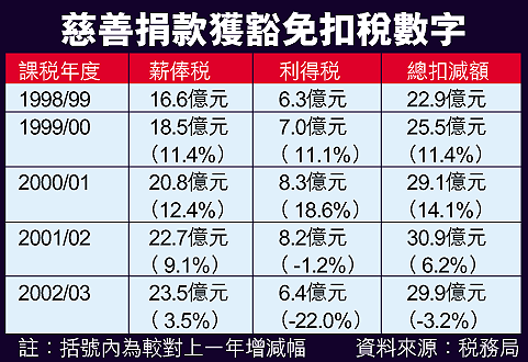 稅務局數字顯示,過去五年打工仔善款數字均較公司捐款高出逾倍,經濟不景未有打擊助人熱心,每年因此獲扣減的薪俸稅由九八?九九年度的十六億六千萬元,增至○二?○三年度的二十三億五千萬元。但同期因捐出善款獲扣減的利得稅,只由六億三千萬元微增至六億四千萬元,較之前三年顯著下跌。