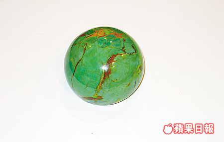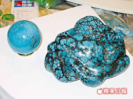 圖左的球形礦石,屬於BlueTurquoise,產自伊朗,是當地某一礦場最大及最少雜質的一顆製品,價值逾6萬港元。