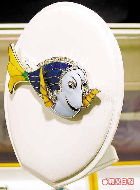 以燒青製成的心口針,令「蜻蜓」擁有晶瑩通透的翅膀,充滿生機;同以燒青製造的魚形釦針(圖),趣致可愛,兩款配飾的出口價約由1.2萬至2.3萬港元。