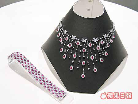 11卡緬甸紅寶石加上10卡南非鑽石製成的頸鏈(圖右),充滿魅力,批發價為9萬港元;圖左的手鏈同以紅寶石和鑽石製成,售價為5萬港元。