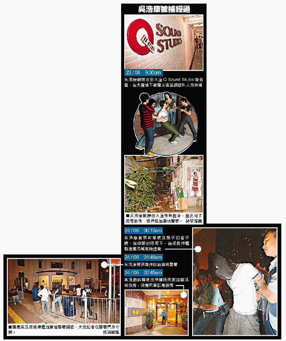至前晚九時半,原在柯士甸道一○五號百安大廈三樓「QSoundStudio」錄音室的吳浩康,離開錄音室落樓步出大廈時,在地下被埋伏在附近的警方毒品調查科探員截停拘捕,扣上手銬拉往大廈後巷仔細調查,其中兩名女探員搜查吳浩康的褲袋及鞋襪,結果在吳浩康的銀包內搜出一點二克的可卡因毒品,即將他押返油麻地警署調查。
