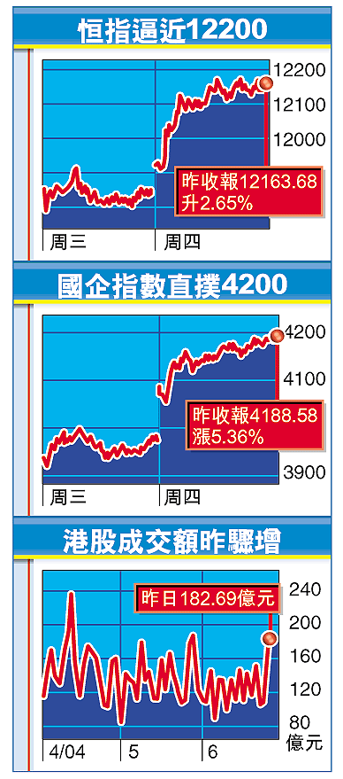 港股昨日在大量資金推動下顯著造好,地產及銀行股受追捧,恒指高開74點後,持續攀升,收報12163,漲313點。即月期指收報12148,低水15點,成交合約增至4.2萬張。滙控(005)大升2元,收報116.5元;中移動(941)也漲4.26%,收報23.25元。