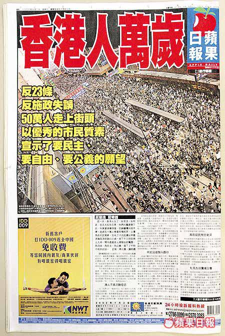 八方一口氣數出香港《蘋果》七個獎同得獎嘅相關報道:最佳中文報章獎、最佳新聞報道獎(梁錦松偷步買車報道)、最佳漫畫獎、優異漫畫獎、最佳專題獎(梅艷芳病逝──留下只有思念)、最佳人權報道獎(7.1大遊行─香港人萬歲)同最佳報章設計獎(宋美齡、梅艷芳去世、美軍攻伊)。