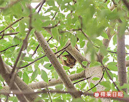 【本報訊】昨午一時許,食物環境衞生署人員前往元朗丹桂村路玉桂園,剿滅一個距民居只有二十呎、懸掛於六十呎高木棉樹樹頂的巨型黑蜂巢,食環署人員須登上消防升降台靠近蜂巢噴射殺蟲藥(圖),待十分鐘後藥力發作,食環署人員估計蜂巢內一百隻兇猛黑蜂已經死去,才動手揮鐵通剿滅蜂巢。 黃學潤攝