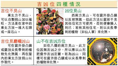 山形雖有基本的吉凶之分,但亦要配合不同的地運再作出詳細推敲。在八運(2004-2023年)之中,東北方見山旺丁(吉位),西南方見山則損丁(凶位)。