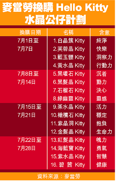 【本報訊】踏入夏季,連鎖快餐廳競爭趨白熱化,鬥新裝潢、新口味食品,令巿民選擇更多;愛「貓」一族今個暑假更忙碌,麥當勞餐廳下月一日起,推出新一輪十六款不同顏色的HelloKitty公仔,每款嵌上不同的水晶,給顧客換購;有學者指出,吉蒂貓加水晶,勢掀起另一次換貓潮。 記者:蔡朗清