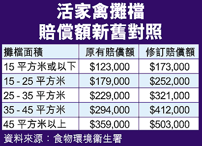 今年五月,政府建議申請撥款二億四千萬元,在一至兩年內贖回全港半數零售雞檔牌照,立法會議員批評賠償太少。政府消息人士昨日透露新方案,除增加特惠金四成外,也調高受影響雞檔工人的再培訓津貼,由原先最高六千元增至八千元。