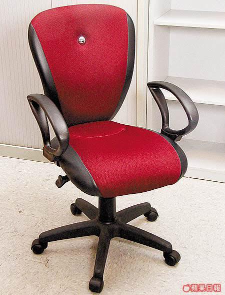 突破一般電腦椅死氣沉沉的色調,這張以棗紅配黑的油壓式旋轉椅,椅背上方並有一顆銀珠作點綴。採用了彈弓椅背,彈性十足,令背部倍覺舒適,工作疲倦時大可向後搖兩搖,好Relax。