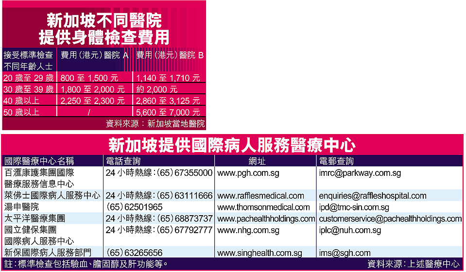 【本報訊】本港市民有否想過到新加坡旅遊,並在當地醫院做身體檢查。新加坡有多家醫院都設有國際病人服務中心,提供醫療、酒店及接送安排等一條龍服務,部份醫療收費更較本港私家服務廉宜,一個基本身體檢查費用不足一千港元,並可即日取報告,本港私家醫院慨歎港府缺乏向外推廣本地醫療服務。 記者:梁洵瑜