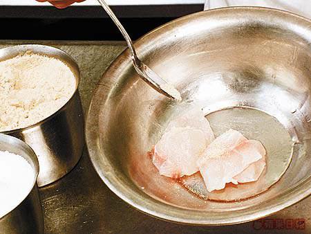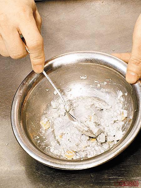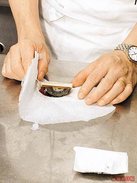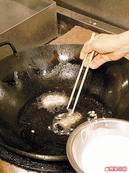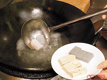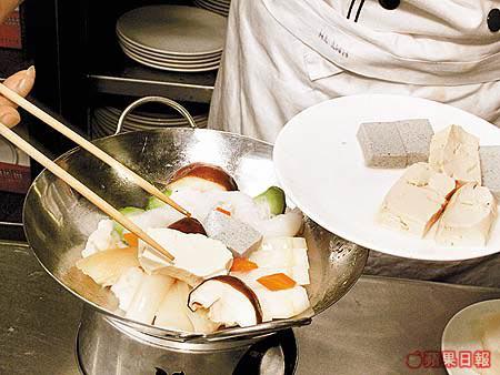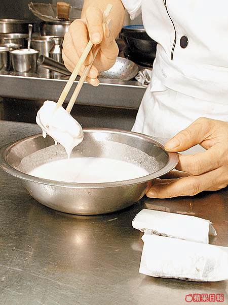 今次示範的張師傅入行二十多年,一直專注粵菜,不過他並不局限用傳統的中菜材料。今次他除了用中式的布包豆腐,也用上日本的胡麻豆腐。張師傅說胡麻豆腐口感比布包豆腐更嫩滑,而他們也會用日本的絹豆腐來代布包豆腐。不過絹豆腐較貴,家庭用布包豆腐也可以。